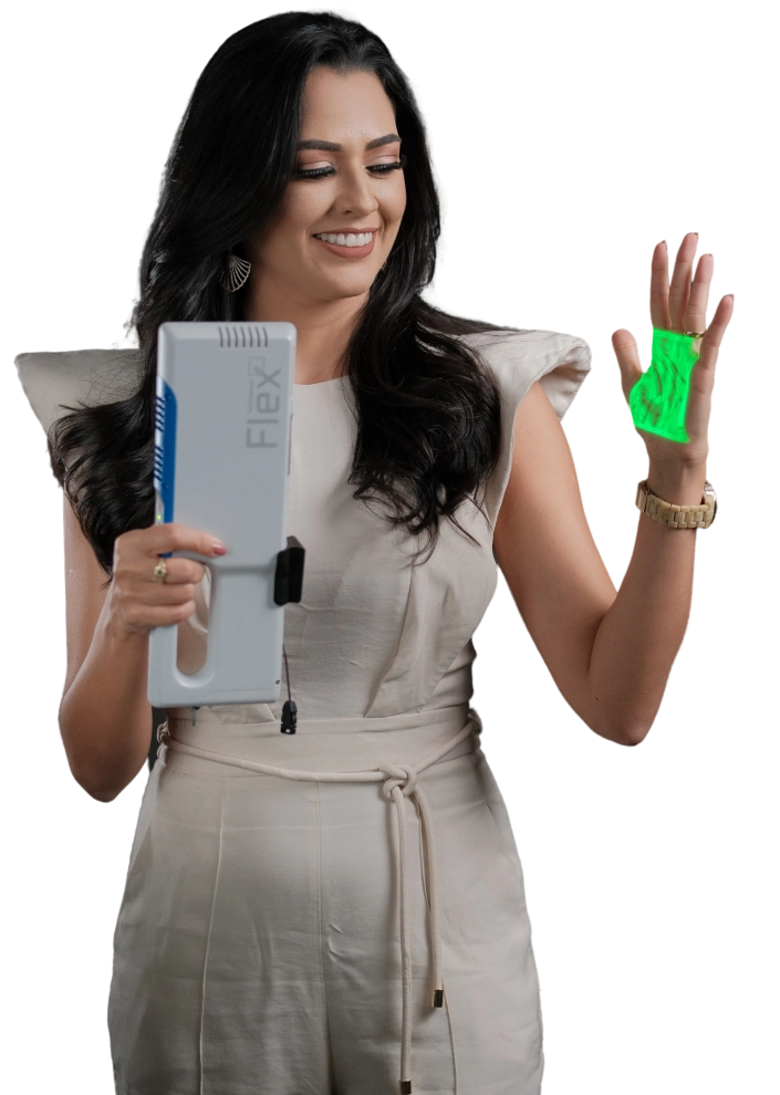 Outra ferramenta importante utilizada é a Realidade Aumentada VeinViewer. Essa tecnologia permite visualizar as veias em tempo real, auxiliando na localização de veias difíceis de encontrar, principalmente quando se trata de veias nutridoras, varizes e microvasos.